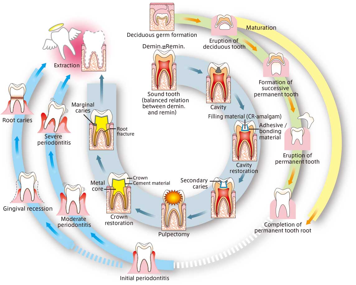 Figure: Negative spiral from tooth development to maturity and tooth loss